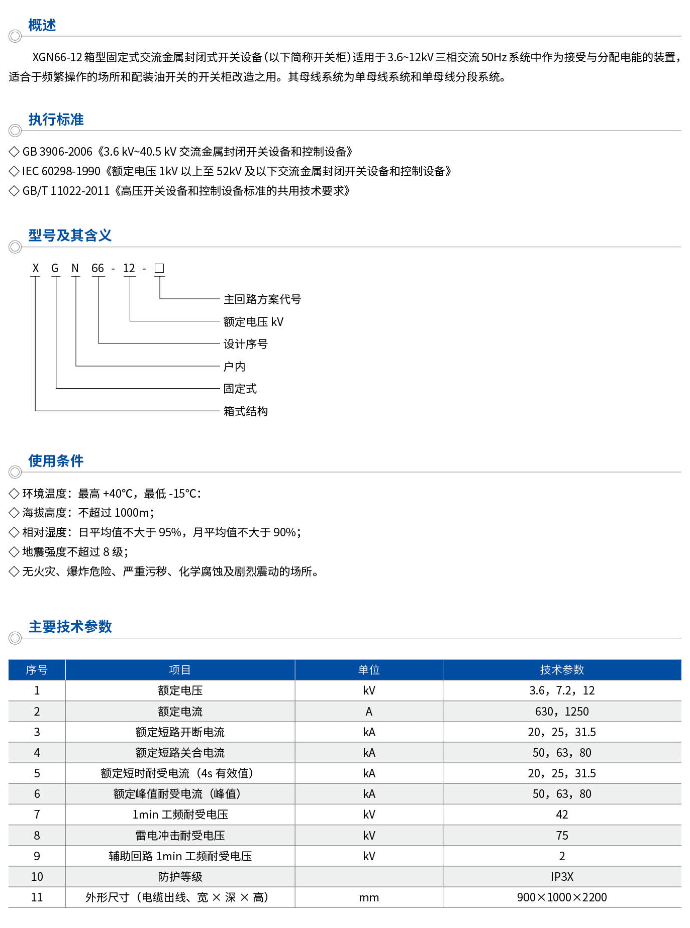 XGN66-12箱型固定式交流金屬封閉式開關設備(以下簡稱開關柜)適用于3.6~12kV三相交流50Hz系統中作為接受與分配電能的裝置,適合于頻繁操作的場所和配裝油開關的開關柜改造之用。其母線系統為單母線系統和單母線分段系統。