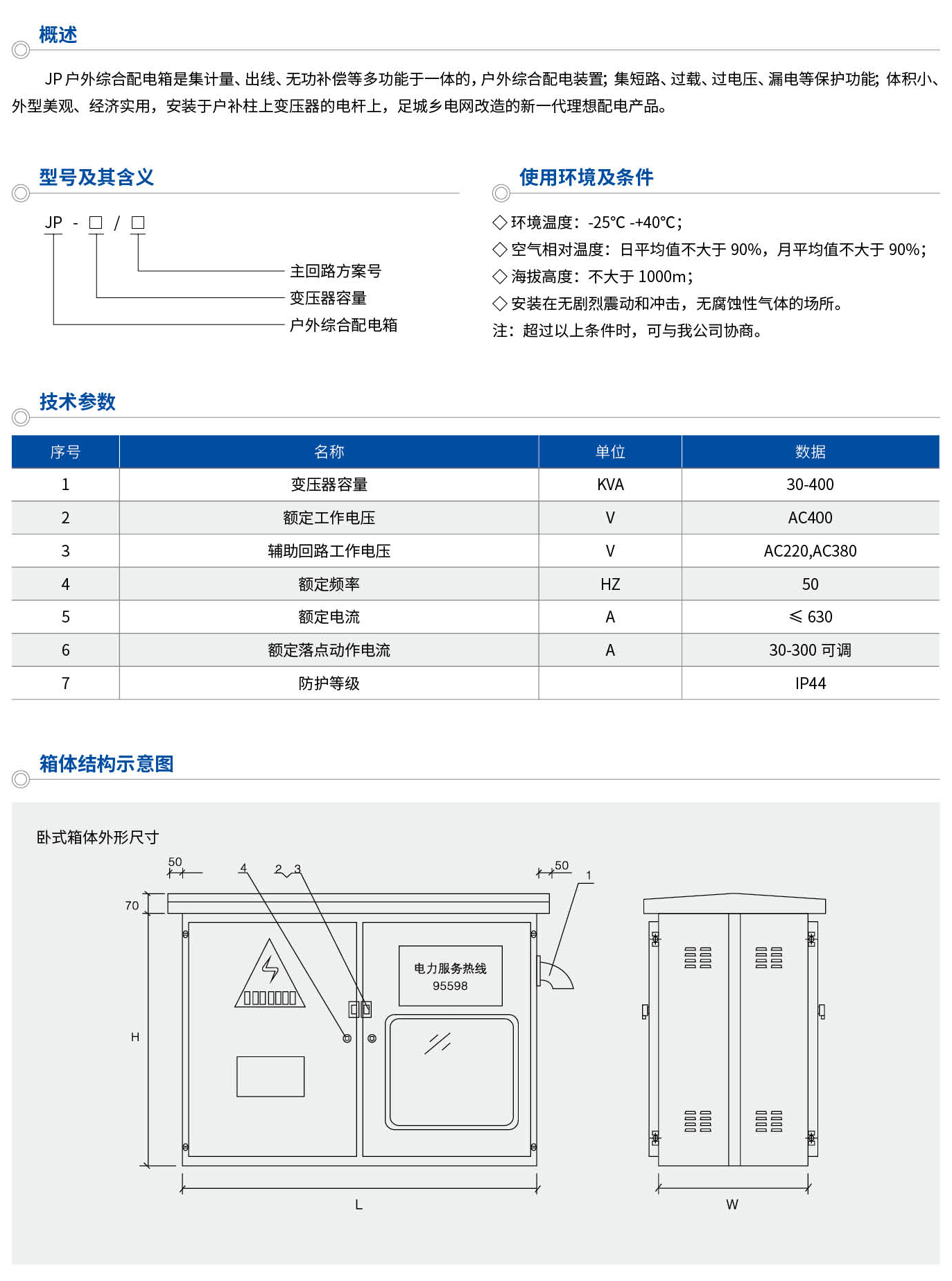 JP戶外綜合配電箱是集計(jì)量、出線、無(wú)功補(bǔ)償?shù)榷喙δ苡谝惑w的,戶外綜合配電裝置;集短路、過(guò)載、過(guò)電壓、漏電等保護(hù)功能;體積小、外型美觀、經(jīng)濟(jì)實(shí)用,安裝于戶補(bǔ)柱上變壓器的電桿上,足城鄉(xiāng)電網(wǎng)改造的新一代理想配電產(chǎn)品。